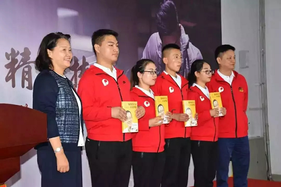 付俊、徐碚向?qū)W生代表贈(zèng)予書籍,卜玉龍向?qū)W生代表授予“保利星火班”旗幟。