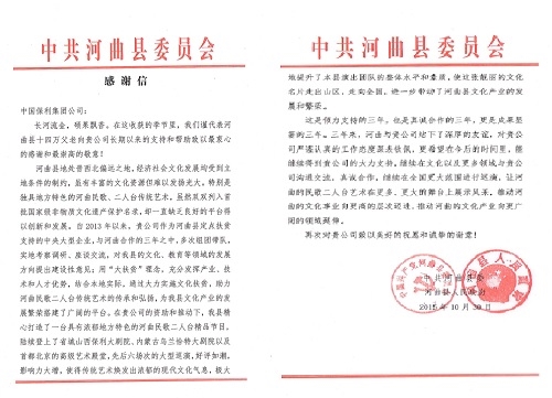 10月30日,山西省河曲縣委、縣政府代表十四萬河曲縣父老致信集團公司,就集團公司在河曲縣扶貧工作中給予的支持和幫助致以感謝。據了解,自2013年集團公司在河曲縣開展定點扶貧工作以來,精心打造具有濃郁地方特色的河曲民歌二人臺精品節目,并在北京、山西、內蒙古等地開展六場次大型巡演,帶動了河曲縣文化產業發展繁榮。